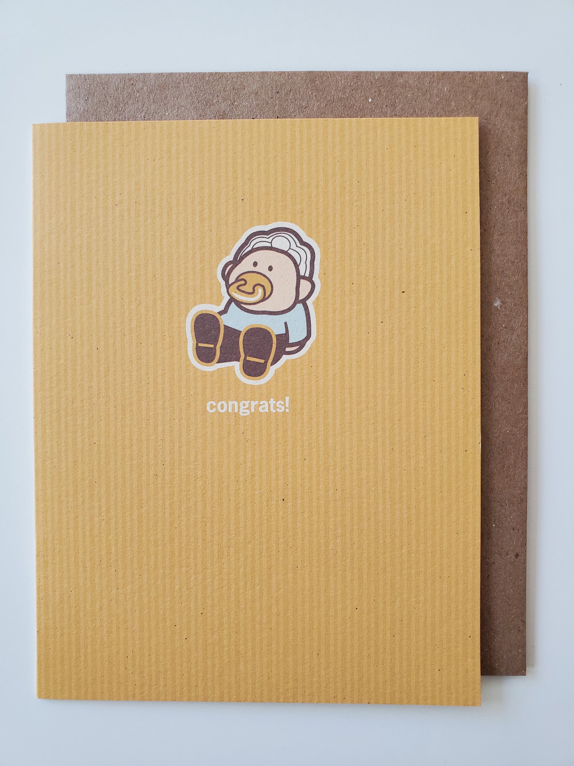 Cards are printed with veggie based inks on heavy cover stock containing post consumer recycled content.Single cards come with a 100% recycled envelope sealed in a biodegradable corn based clear bag.