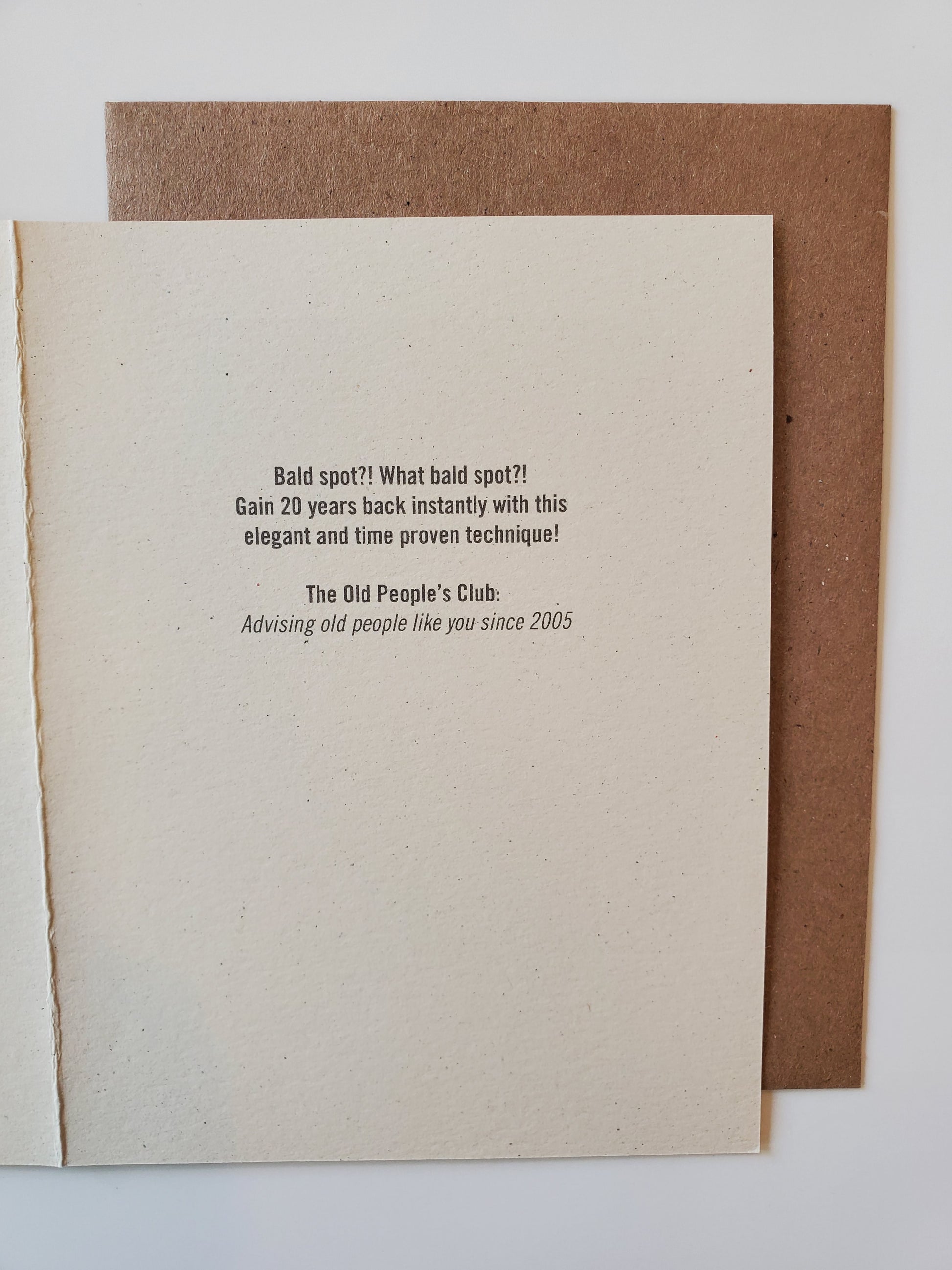 inside: Bald spot?! What bald spot?! Gain 20 years back instantly with this elegant and time proven technique! The Old People's Club: Advising old people like you since 2005