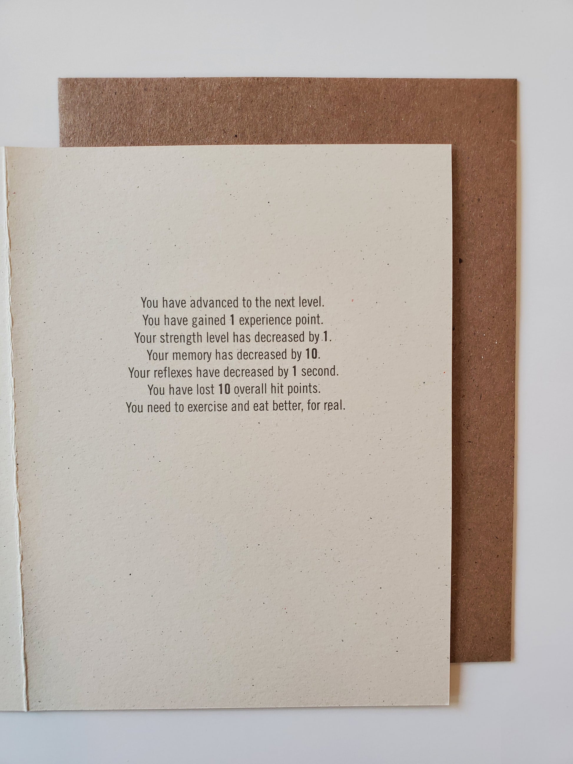 inside: You have advanced to the next level. You have gained 1 experience point. Your strength level has decreased by 1. Your memory has decreased by 10. Your reflexes have decreased by 1 second. You have lost 10 overall hit points. You need to exercise and eat better, for real.