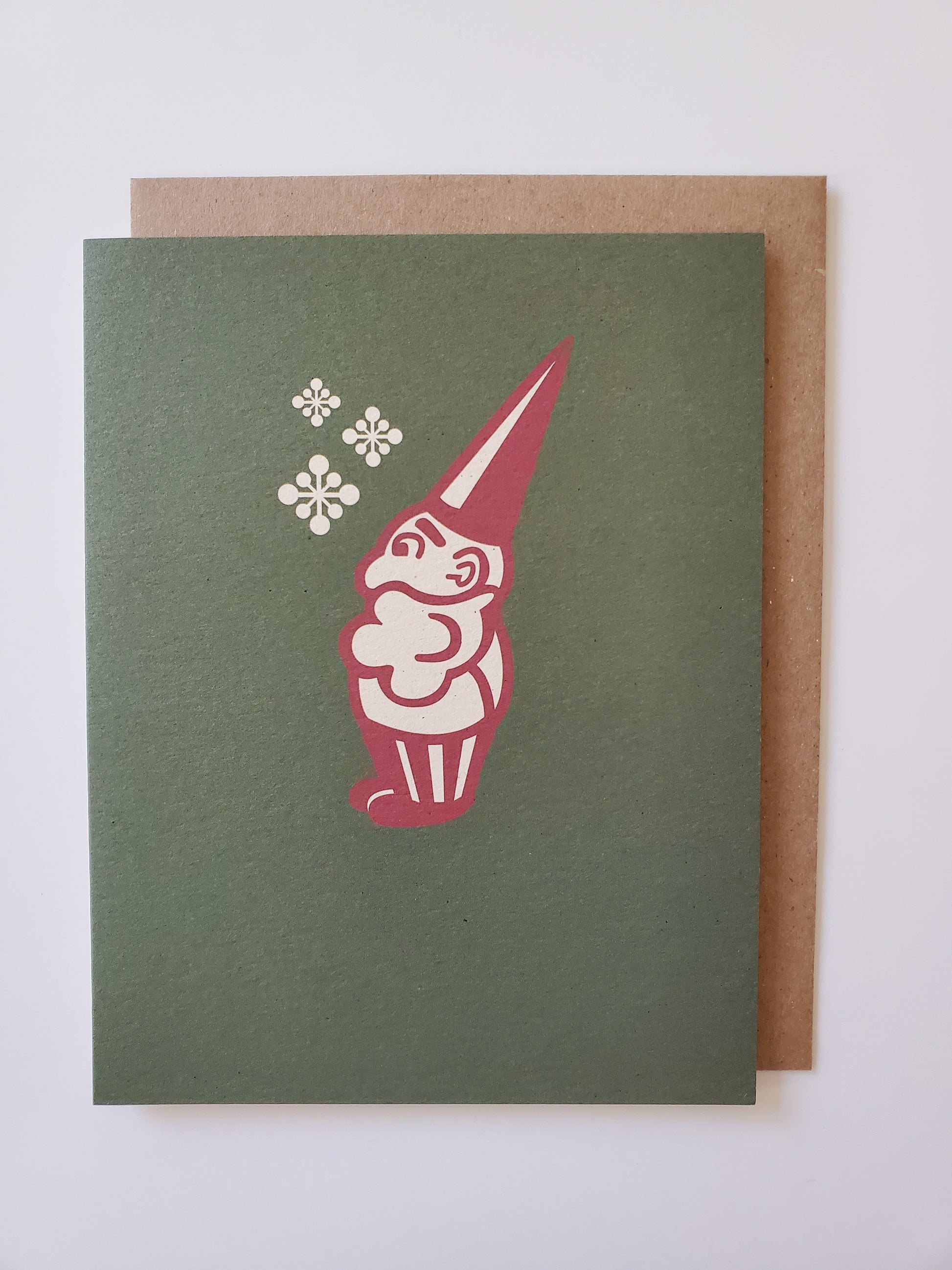 Cards are printed with soy based inks on heavy cover stock containing post consumer recycled content.Single cards come with a 100% recycled envelope sealed in a biodegradable corn based clear bag.